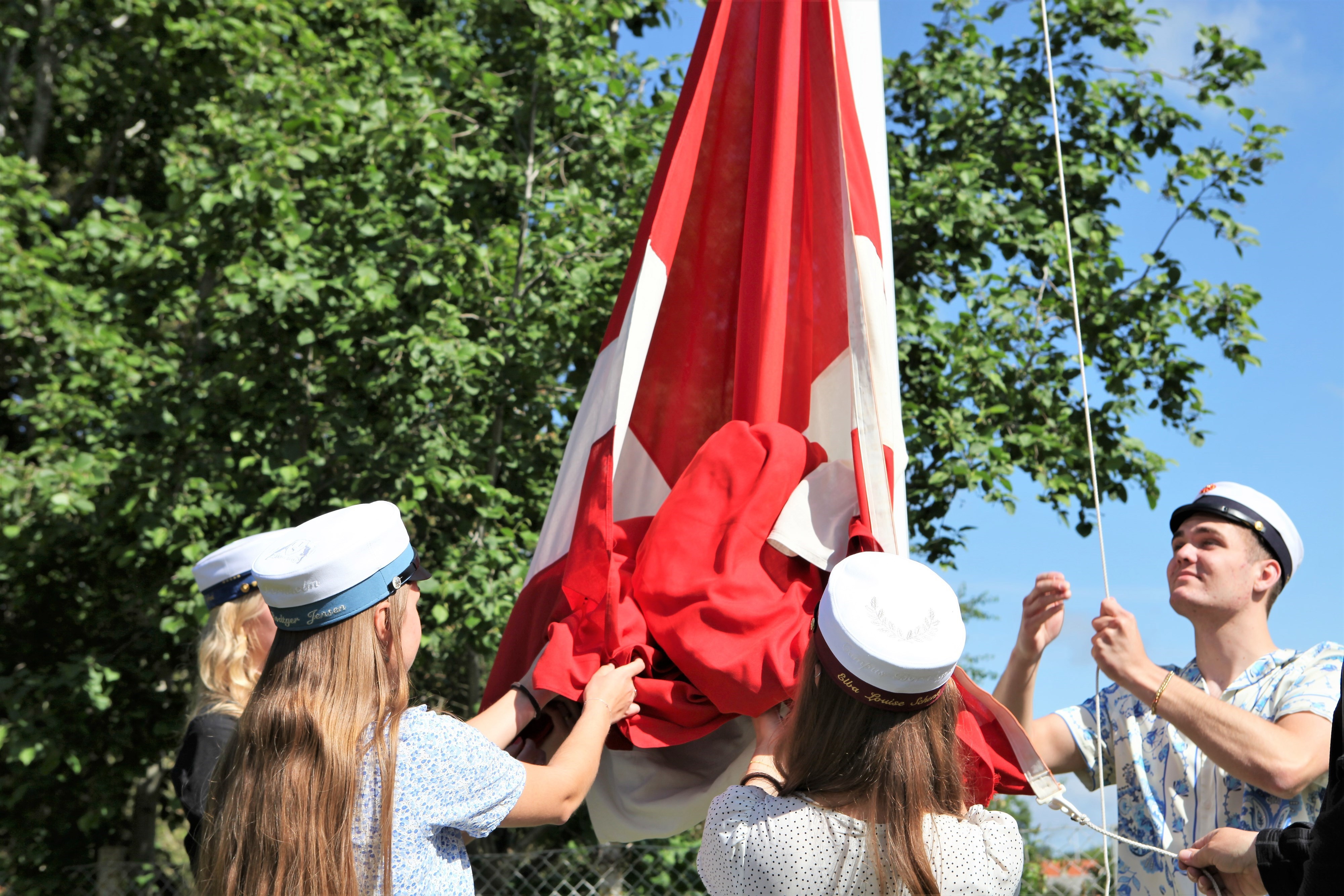 Årets 4 første fra hhv. HHX, HF, STX og HTX samledes ude campuspladsen kl. 10.00 for at hejse flaget sammen.